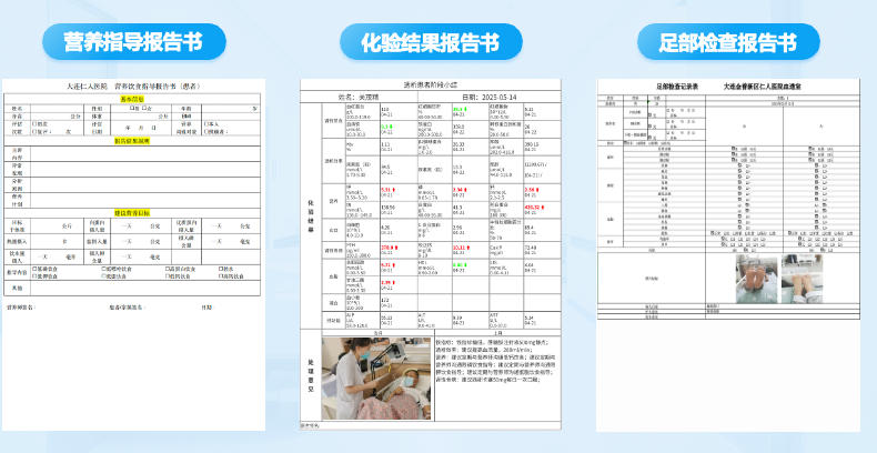 通过图形化的化验报告、营养报告、足部检查报告向患者进行床旁说明。增强患者的治疗意愿和满意度。