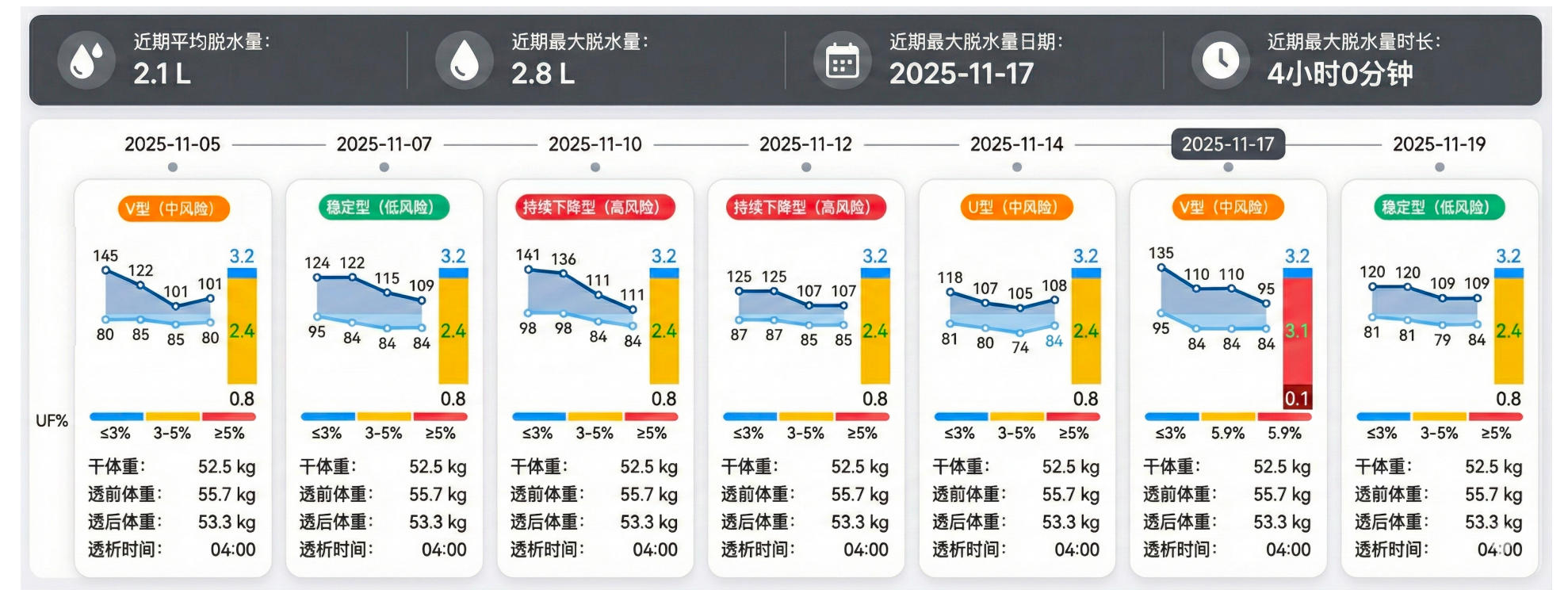 自动记录透前体重、透后体重、脱水量等数据,生成可视化趋势图,直观呈现体重变化规律和干体重偏离情况。