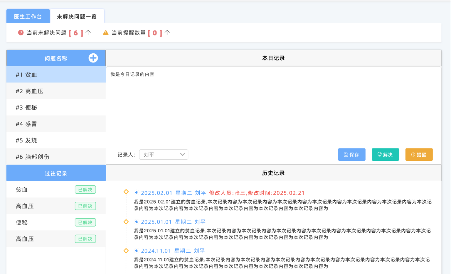 可为每一位患者新建问题清单,对同一问题的历史治疗方案进行查询,确保治疗方案与护理计划的连续性与准确性。未解决问题与过往已结束问题在同一页面展示,方便医护人员随时回顾历史记录。